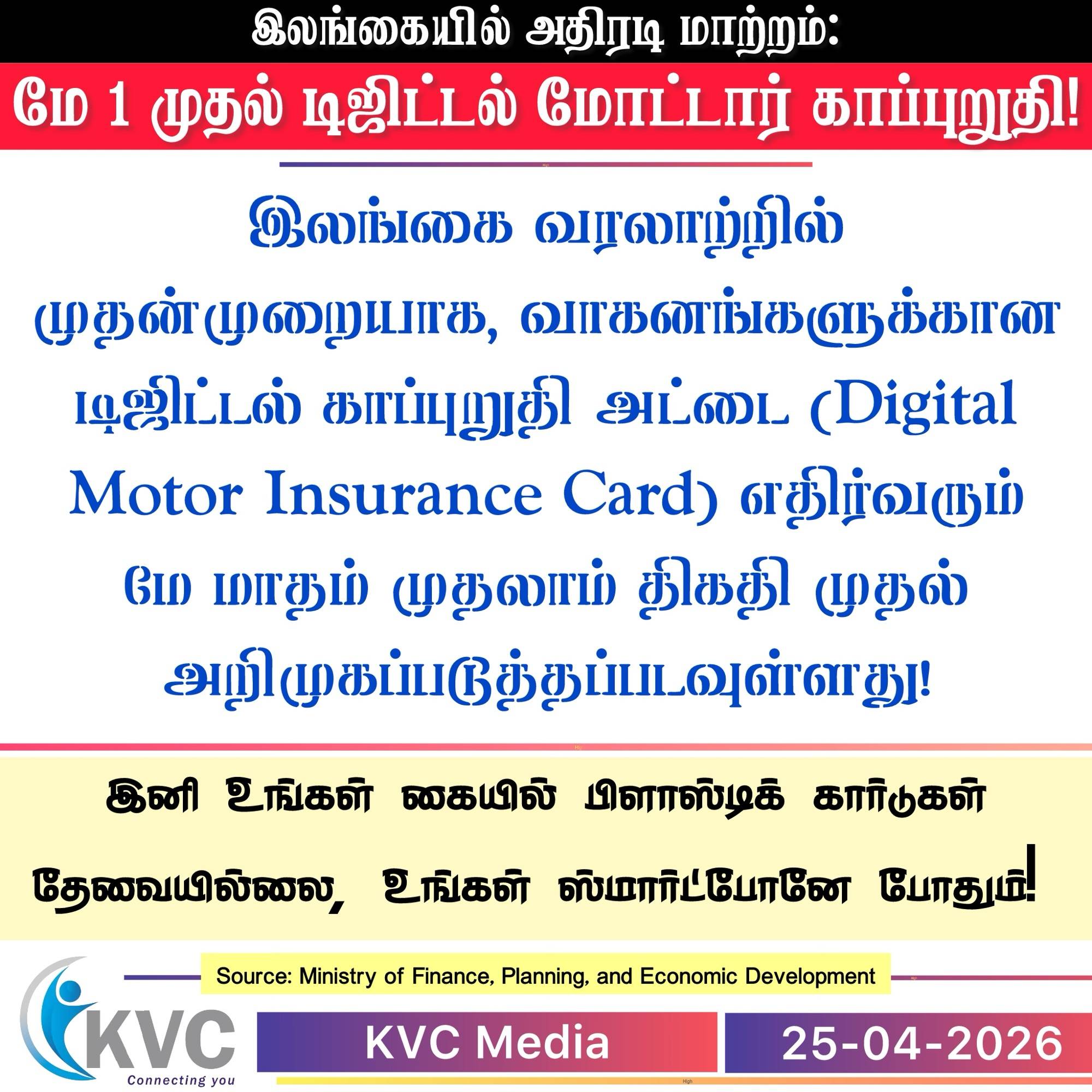 தேசிய டிஜிட்டல் மயமாக்கலை நோக்கிய பயணத்தில், இலங்கையில் முதன்முறையாக வாகனங்களுக்கான டிஜிட்டல் காப்புறுதி அட்டை மே 1 முதல் அறிமுகமாகிறது.