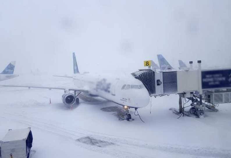 இந்நிலையில் பனிப்புயல் காரணமாக ஏறத்தாழ 1,400 விமான சேவைகள் ரத்து செய்யப்பட்டுள்ளதாக தகவல் தெரிவிக்கப்பட்டுள்ளது. சாலைகளில் கொட்டிக் கிடக்கும் பனிக்குள் சிக்கிக் கொண்ட வாகனங்களை மீட்கும் முயற்சியில் மக்கள் ஈடுபட்டனர். பனிப்படர்ந்த இடங்களில் இயந்திரங்கள் மூலம் பனி அகற்றப்பட்டு வருகிறாது. தரையில் இருந்து 2 அடி உயரத்திற்கு பனி கொட்டிக் கிடப்பதால் வாகனப் போக்குவரத்து துண்டிக்கப்பட்டுள்ளது.