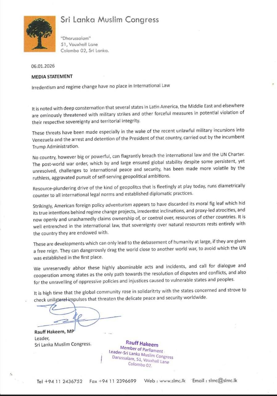 எந்த நாடும் சர்வதேச சட்டத்தையும், ஐ.நா. சாசனத்தையும் மீறிச் செயற்பட முடியாது.கண்டண அறிக்கையில் முஸ்லிம் காங்கிரஸ் தலைவர் ஹக்கீம் காட்டம்